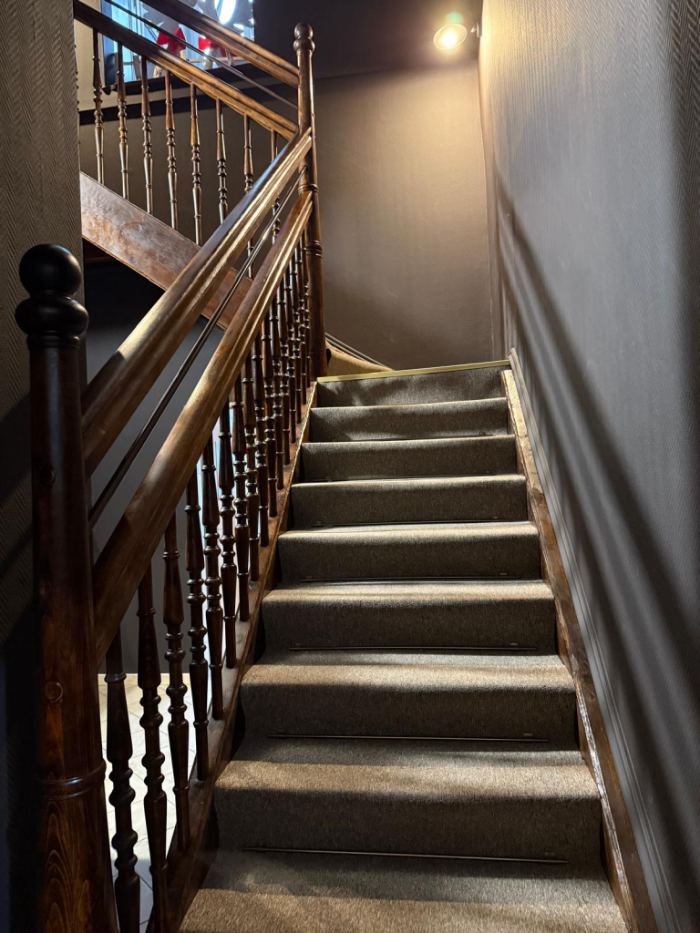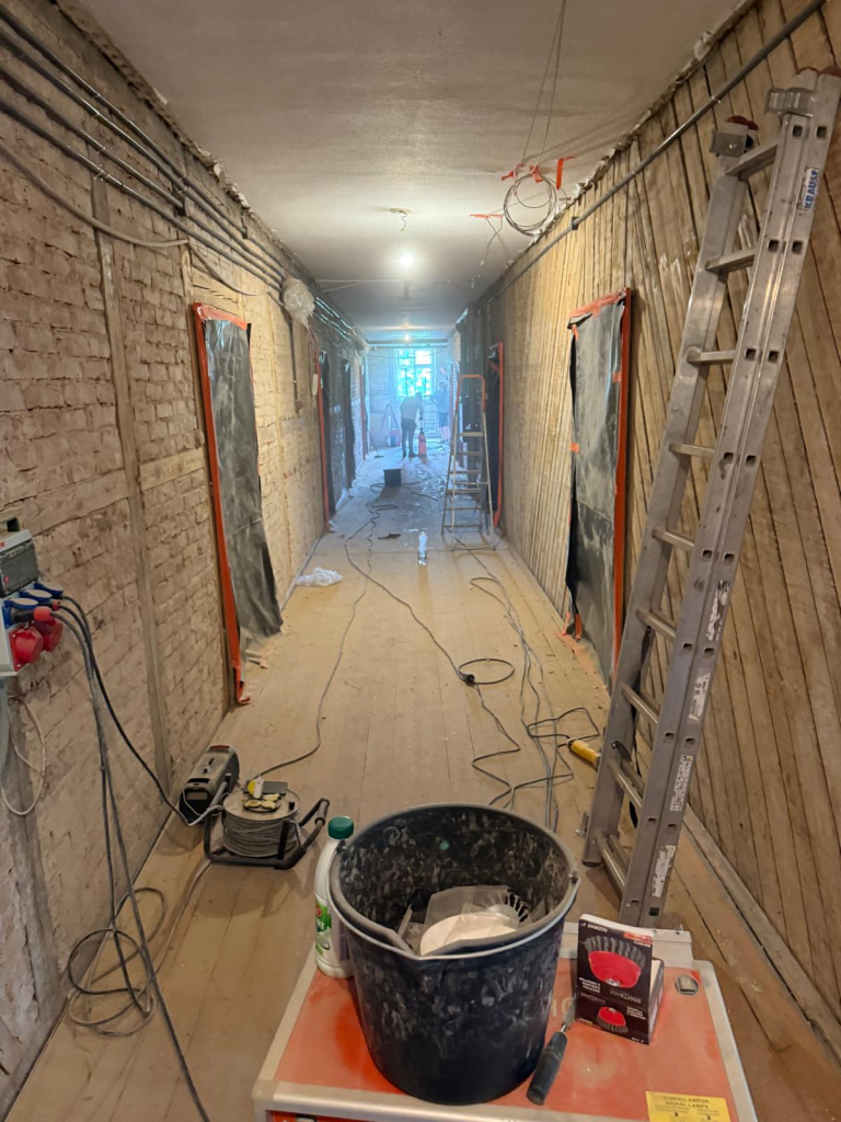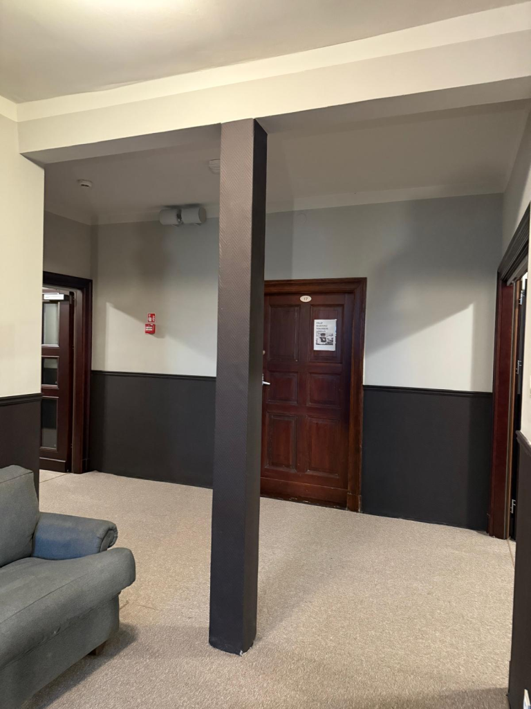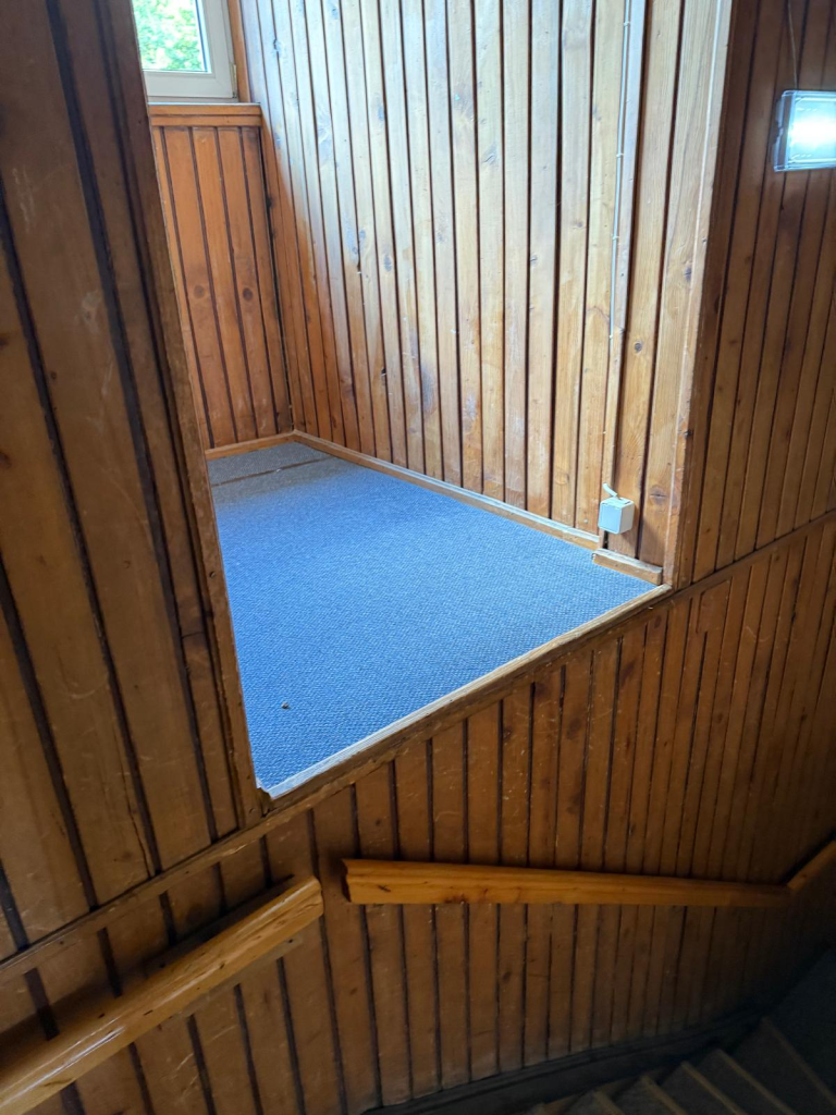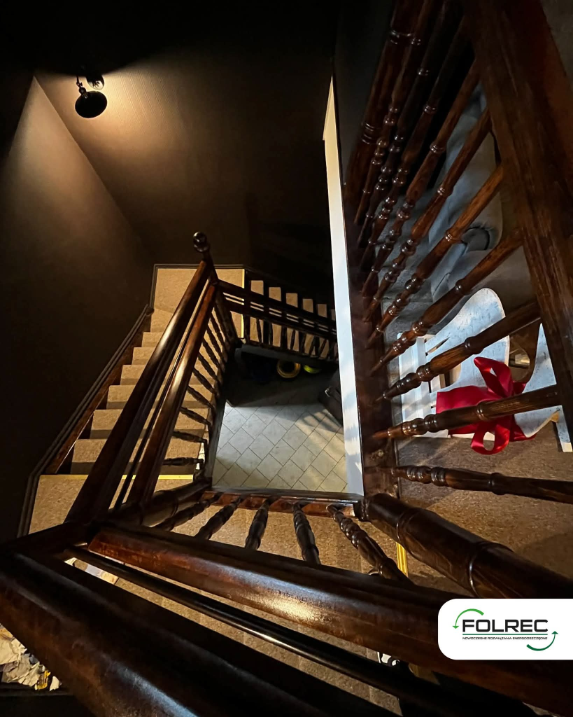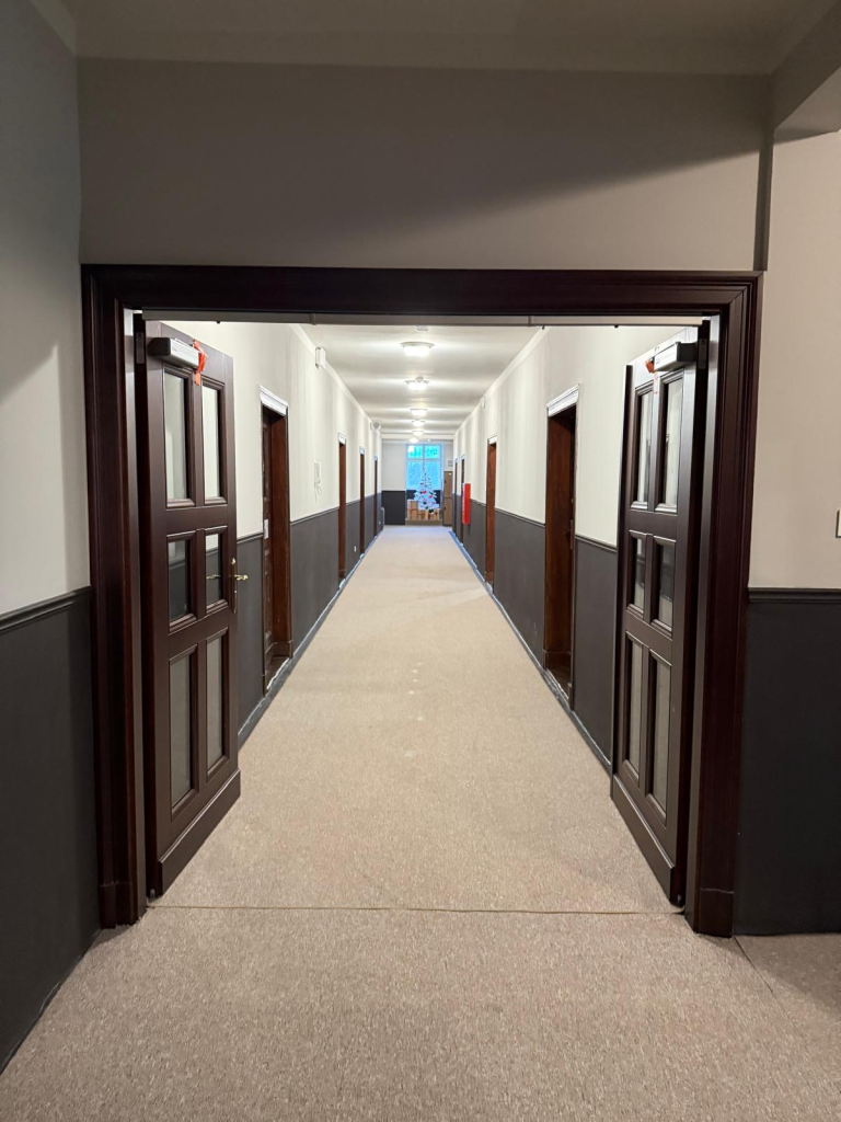 Kompleksową modernizację przeszły przestrzenie wspólne – korytarze oraz klatka schodowa – z zachowaniem pierwotnego stylu budynku oraz wytycznych konserwatorskich. W ramach prac wykonano gruntowną renowację schodów: usunięto zużyte elementy i zamontowano nowe drewniane schody wraz z poręczami, nawiązujące do oryginalnego charakteru klatki schodowej. Na korytarzach zdemontowano boazerię, odsłonięto i odpowiednio zabezpieczono elementy drewniane, odnowiono ściany oraz wykonano nowe wykończenia, które podkreślają spójność i estetykę przestrzeni. Istotnym elementem inwestycji była również całkowita wymiana instalacji elektrycznej oraz zamontowanie drzwi ognioodpornych, co znacząco podniosło poziom bezpieczeństwa uczniów, wychowanków oraz pracowników Ośrodka.