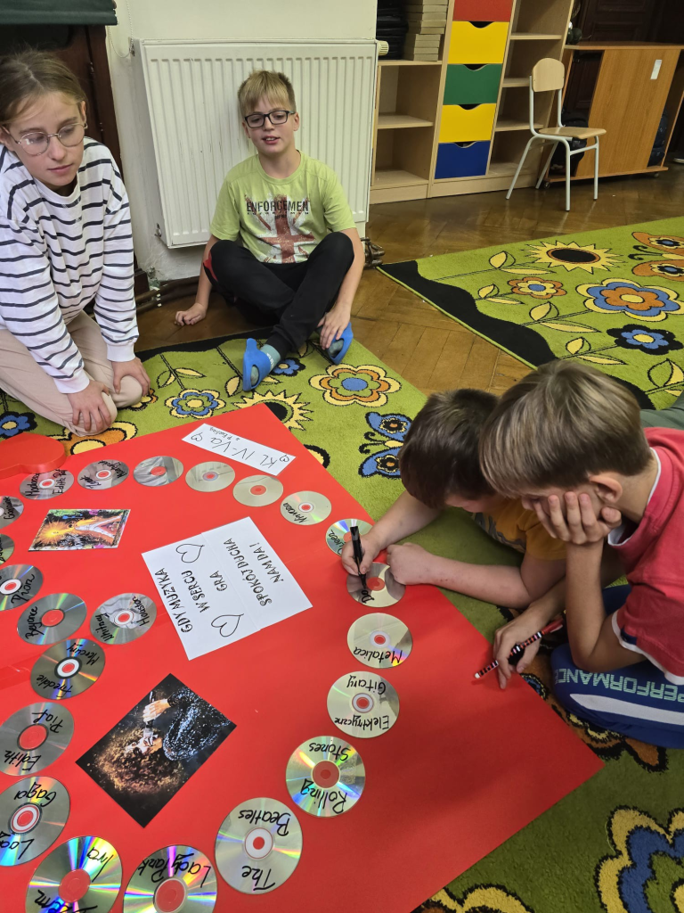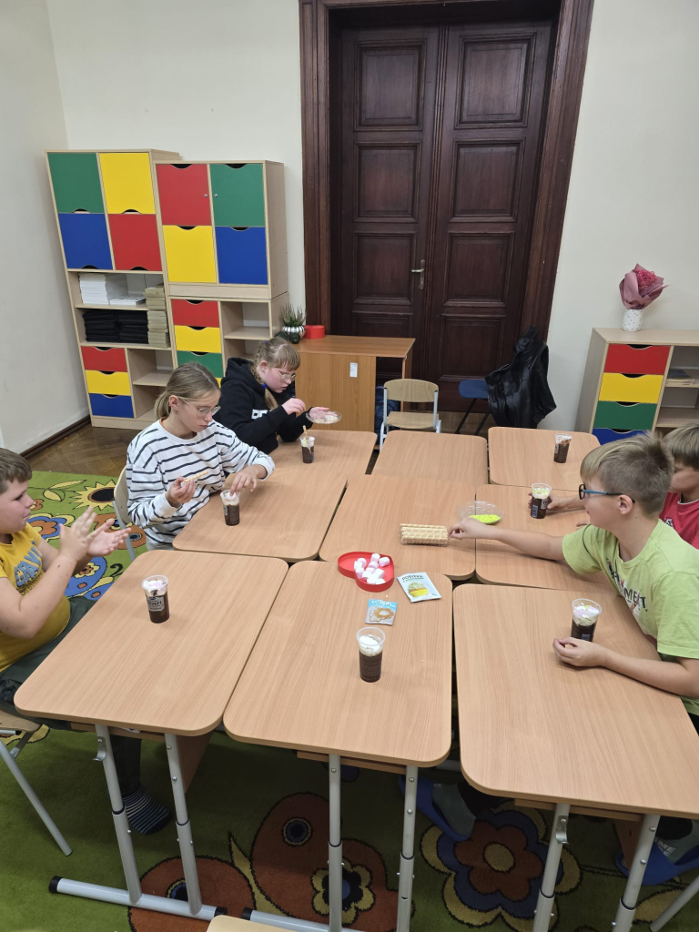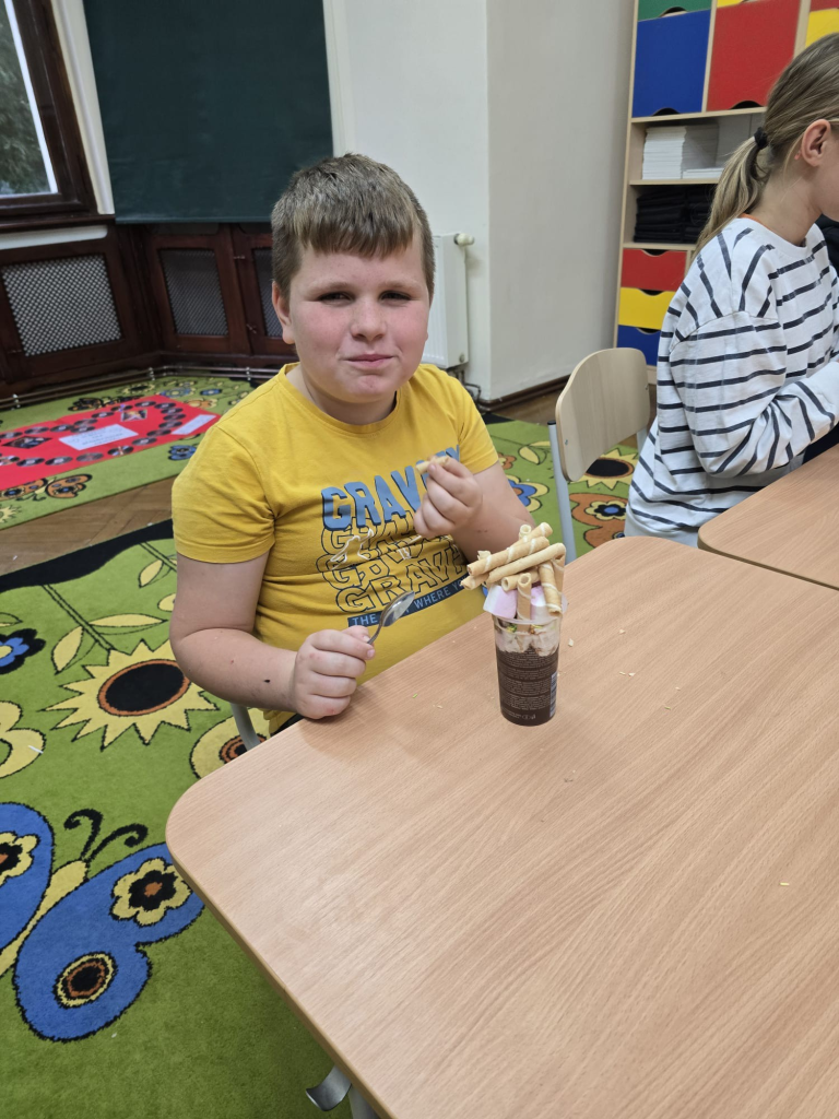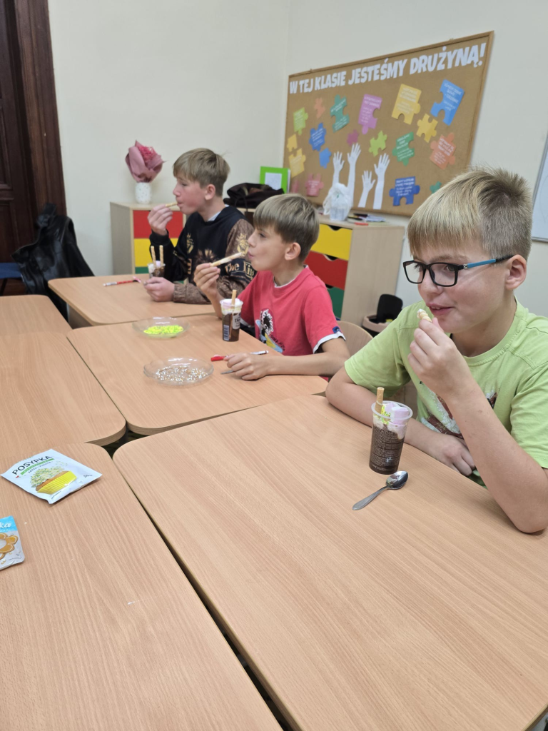 Przy okazji świętowania Dnia Chłopca, podczas którego dziewczynki wręczyły kolegom upominki, cała klasa wspólnie przygotowała pyszny deser. W dalszej części SPOTKANIA INTEGRACYJNEGO pod hasłem GDY MUZYKA W SERCU GRA – SPOKÓJ DUCHA NAM DA! wykonany został plakat muzyczny na Światowy Dzień Muzyki przy użyciu różnych technik i akcesoriów muzycznych. Spotkanie wzbudziło wiele wspaniałych przeżyć , pozytywnych emocji, kreatywnych doświadczeń oraz inspiracji.