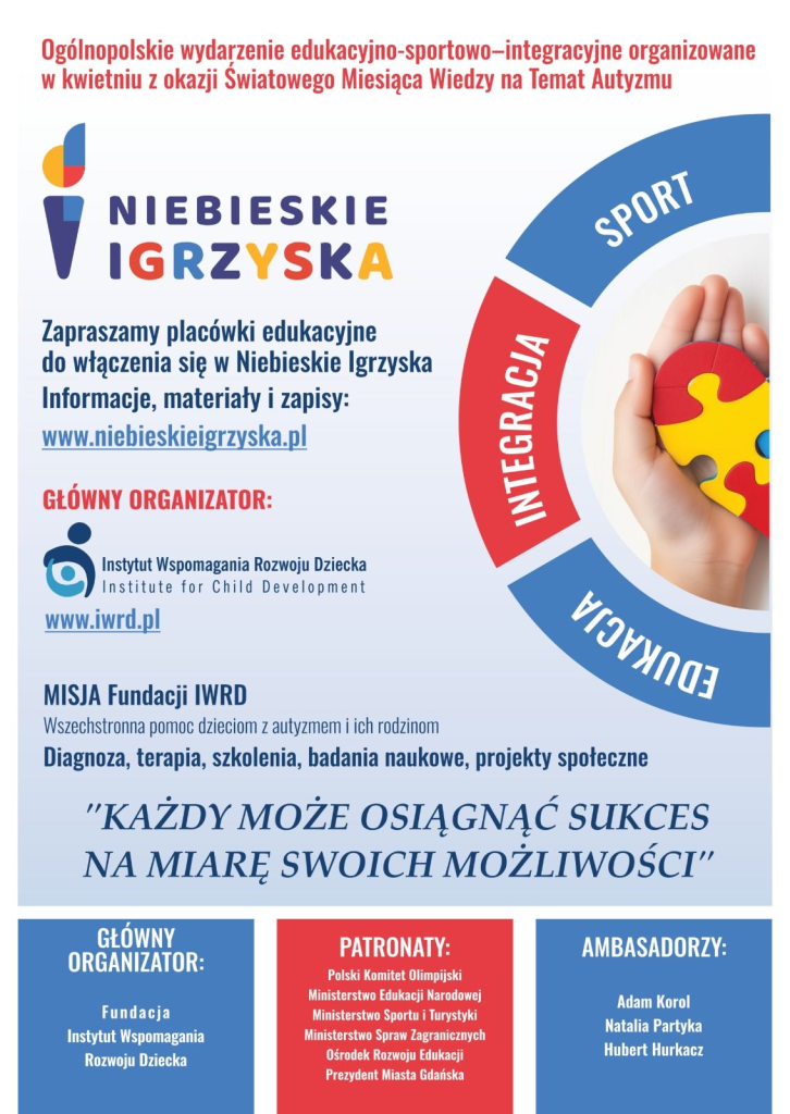 W naszej szkole pamiętamy o tym, jak ważna jest akceptacja, zrozumienie i budowanie świata dostępnego dla każdego. Dlatego informujemy, że bierzemy udział w jubileuszowych Niebieskich Igrzyskach. To ogólnopolskie wydarzenie o charakterze edukacyjnym oraz sportowo-integracyjnym. Przedsięwzięcie jest formą obchodów Światowego Dnia Świadomości Autyzmu przypadającego na 2 kwietnia oraz Światowego Miesiąca Wiedzy na Temat Autyzmu. Nasze działania w ramach Igrzysk rozpoczniemy po przerwie świątecznej. To dla nas nie tylko wydarzenie sportowe, ale przede wszystkim okazja do wspólnego przeżywania wartości takich jak szacunek, współpraca i uważność na drugiego człowieka.