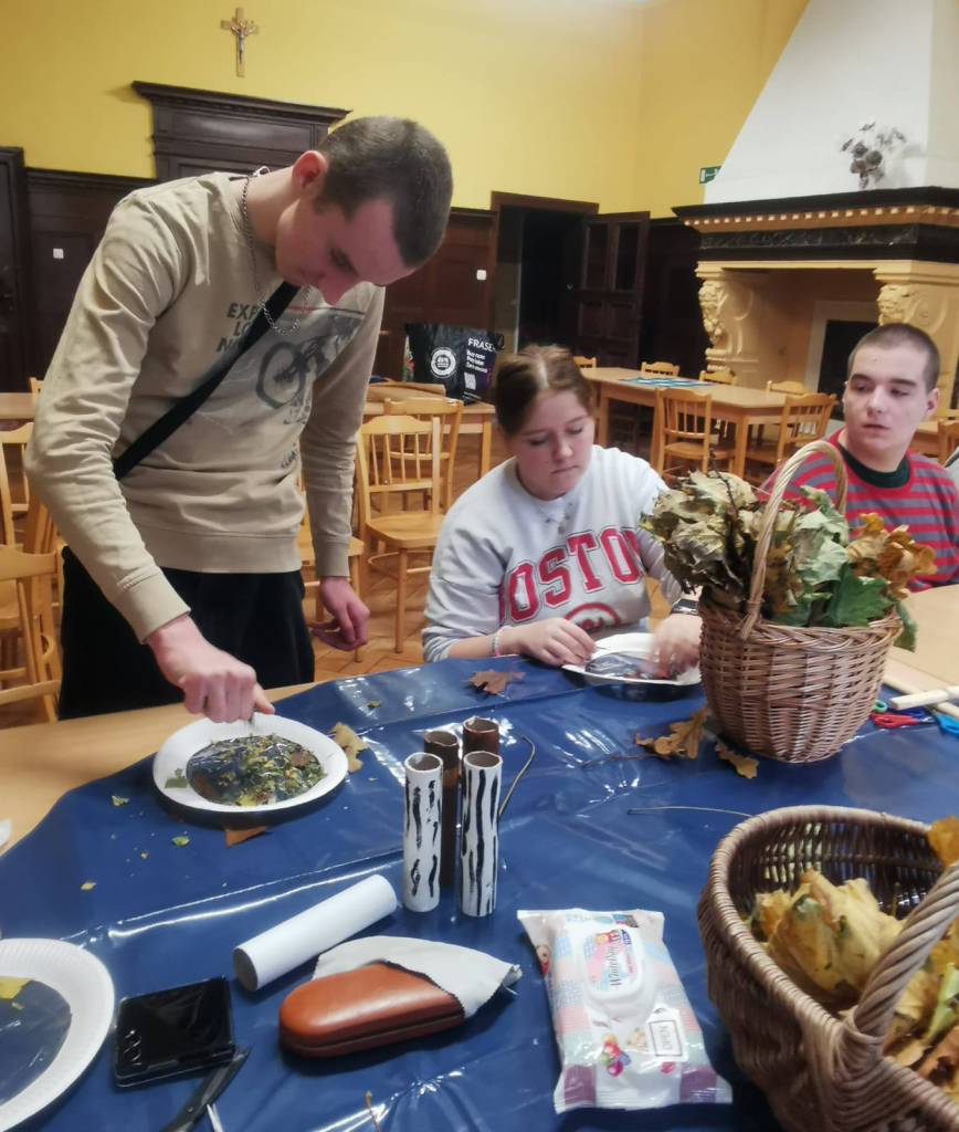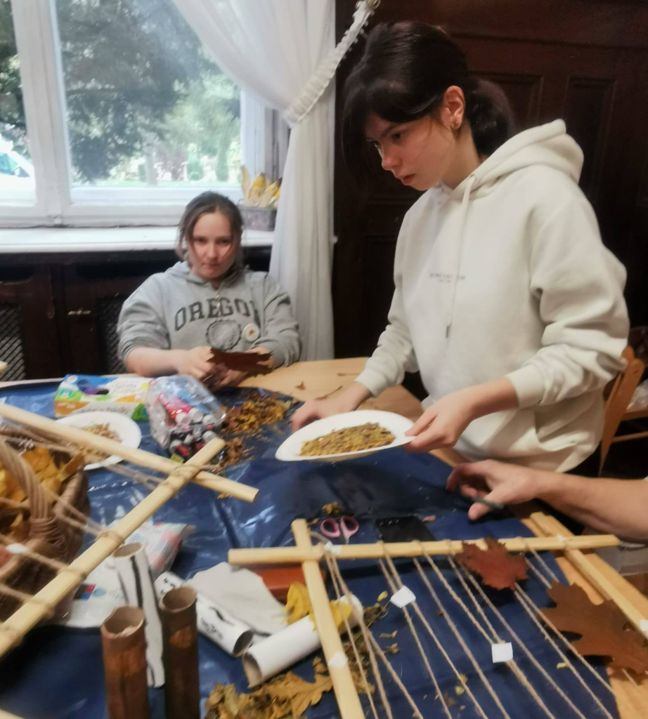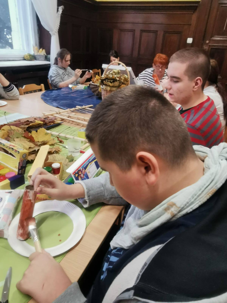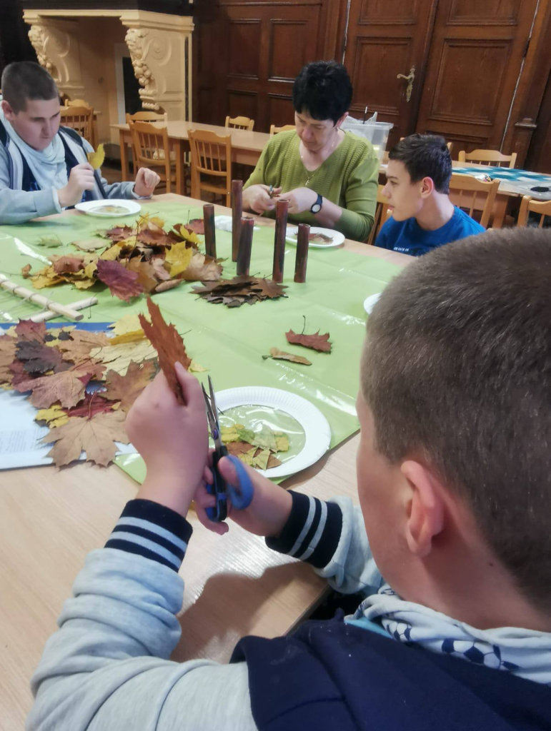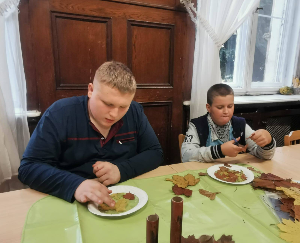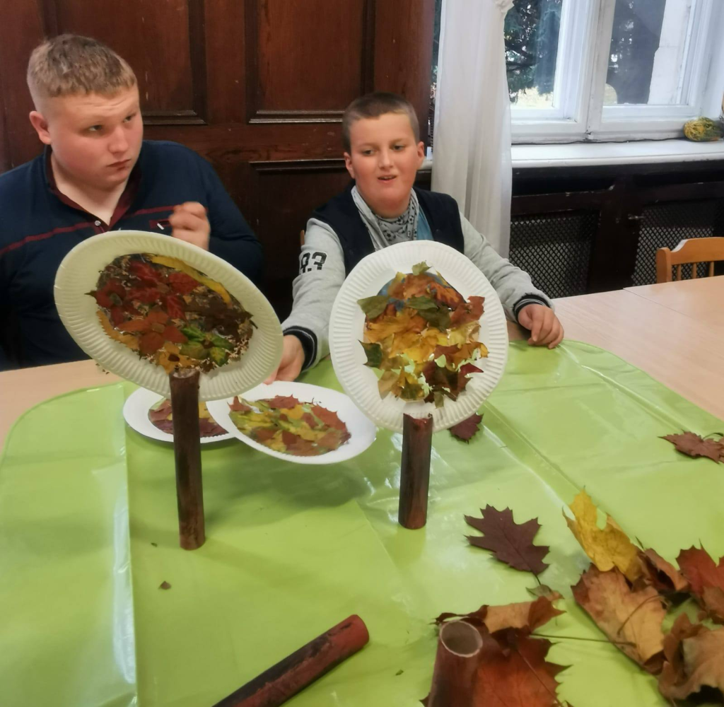 Uczniowie z klasy 5-7-8e i 7-8d uczestniczą z panią Basią i Joasią w Ogólnopolskim Projekcie Edukacyjnym ” Rok Dziecięcej Kreatywność.” Są to Interdyscyplinarne Warsztaty Terapeutyczne. Zajęcia warsztatowe łączyć będą elementy arteterapii, pedagogiki zabawy, ruchu i elementów integracji sensorycznej. 24 października odbyło się pierwsze jesienne spotkanie. Uczniowie wykonali witraże z darów jesieni – kolorowych liści. Rozwiązywali zagadki, rozmawiali o zmianach w przyrodzie. Bardzo dobrze ze sobą współpracowali i dobrze się bawili. Po wykonaniu swoich prac spróbowali jesiennej herbaty.