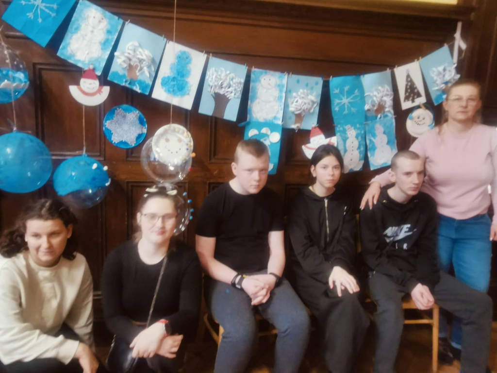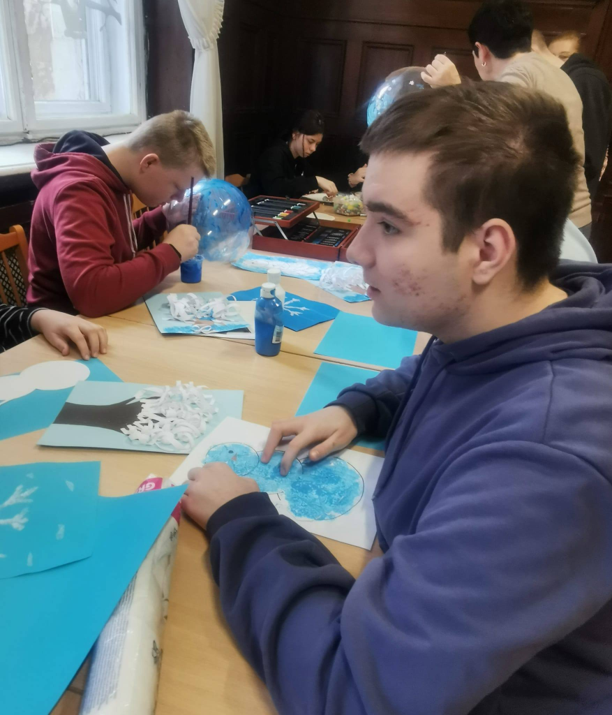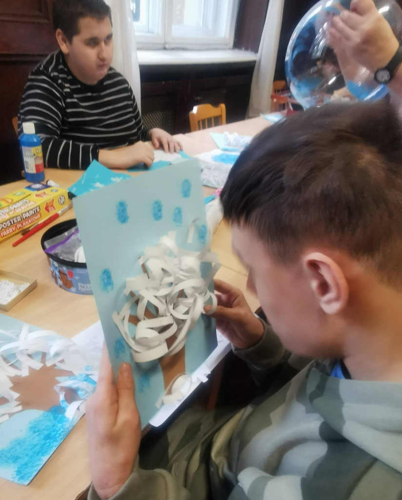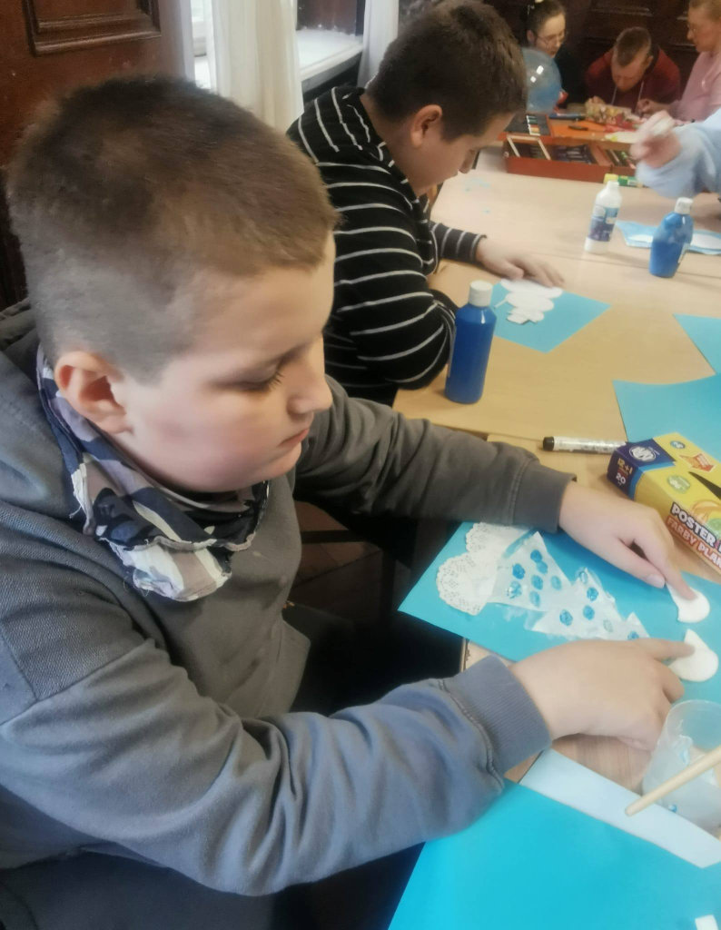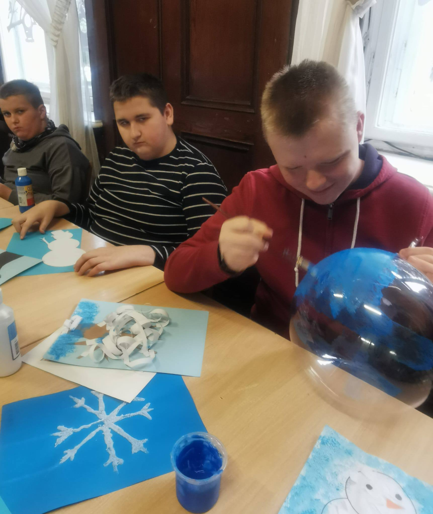 Podczas zajęć uczniowie tworzyli zimowe obrazy, wykorzystując sól kuchenną, płatki kosmetyczne, papierowe serwetki oraz balony. Powstały bardzo ciekawe i oryginalne zimowe dzieła sztuki. W trakcie warsztatów rozmawiano o urokach zimy, rozwiązywano zagadki oraz śpiewano piosenki związane z tematyką zajęć. Wspólne działania rozwijały cierpliwość, wyobraźnię i kreatywność, a także sprzyjały dalszej integracji zespołów klasowych. Po zakończeniu pracy plastycznej przygotowano mini galerię, w której wyeksponowano zimowe krajobrazy. Końcowym punktem warsztatów był poczęstunek: korzenna zimowa herbata, pierniki oraz deser „zimowy puch”.