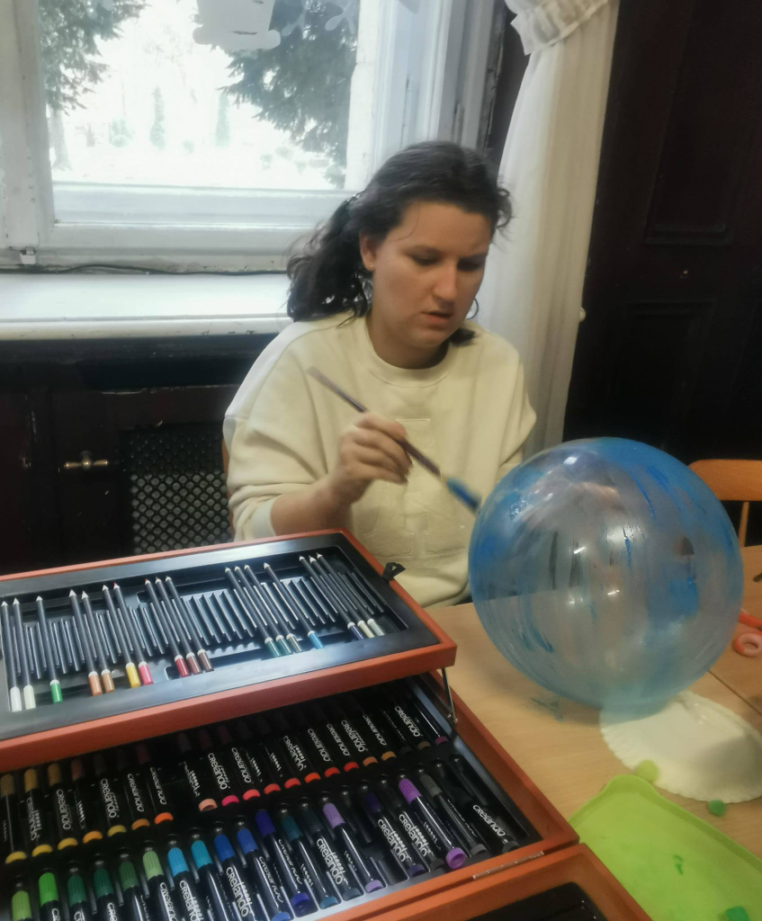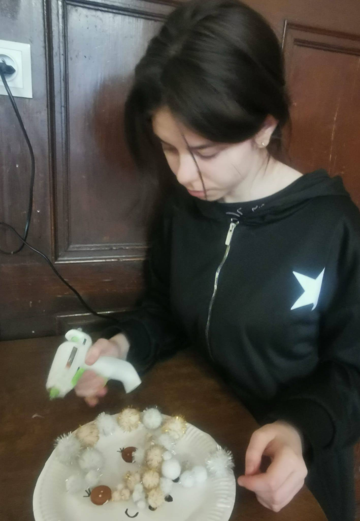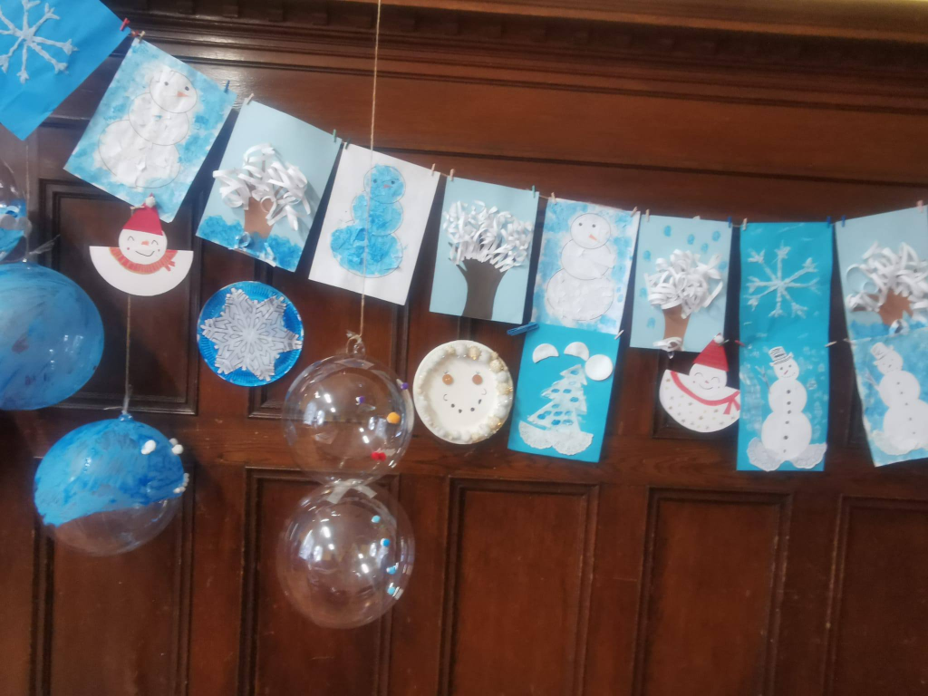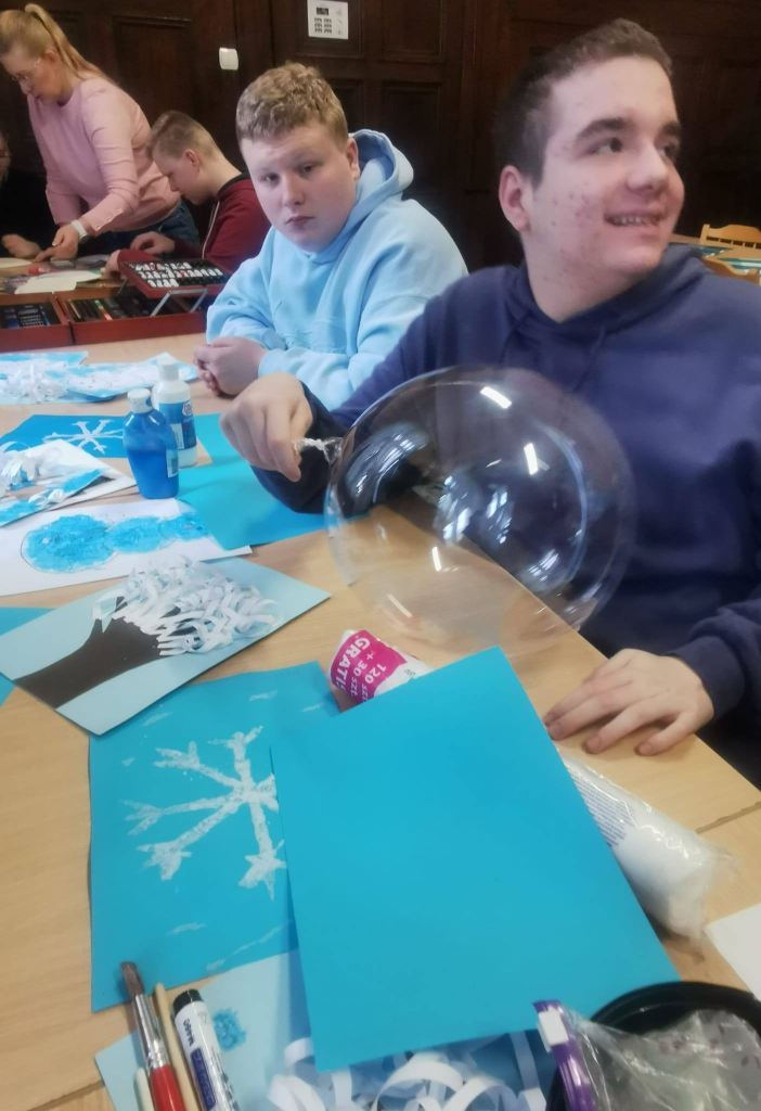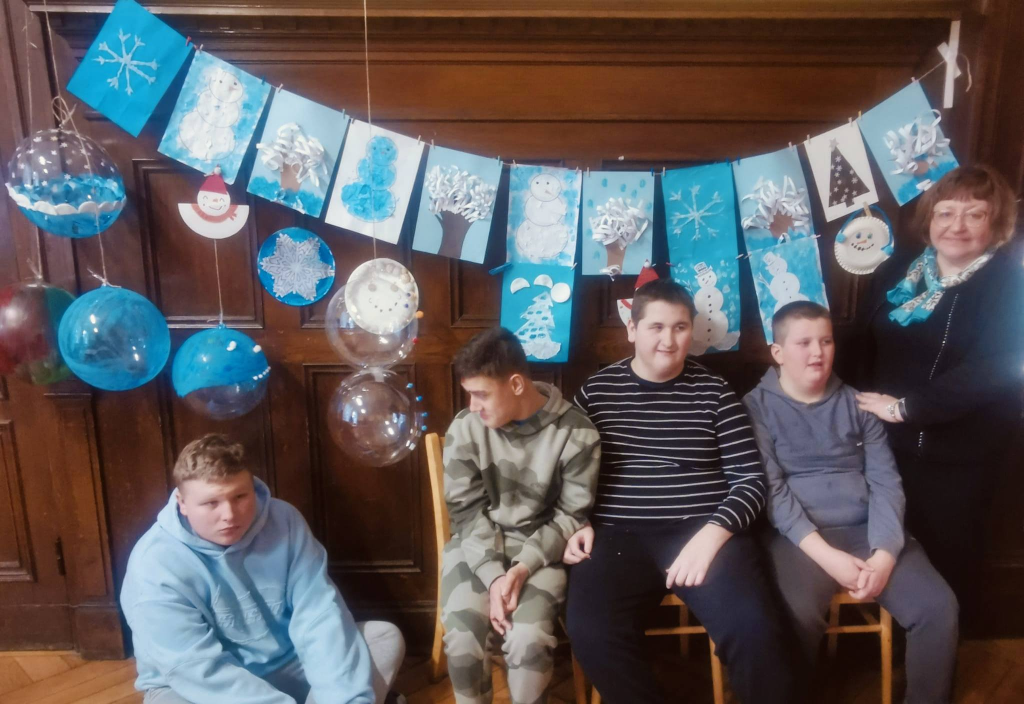 Podczas zajęć uczniowie tworzyli zimowe obrazy, wykorzystując sól kuchenną, płatki kosmetyczne, papierowe serwetki oraz balony. Powstały bardzo ciekawe i oryginalne zimowe dzieła sztuki. W trakcie warsztatów rozmawiano o urokach zimy, rozwiązywano zagadki oraz śpiewano piosenki związane z tematyką zajęć. Wspólne działania rozwijały cierpliwość, wyobraźnię i kreatywność, a także sprzyjały dalszej integracji zespołów klasowych. Po zakończeniu pracy plastycznej przygotowano mini galerię, w której wyeksponowano zimowe krajobrazy. Końcowym punktem warsztatów był poczęstunek: korzenna zimowa herbata, pierniki oraz deser „zimowy puch”.